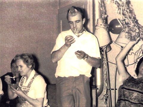 Die Kaffeerunde des SV Grün-Weiß Schredenwinkel in freudiger Erwartung des Bruderkampfes gegen die DDR (WM 1974).